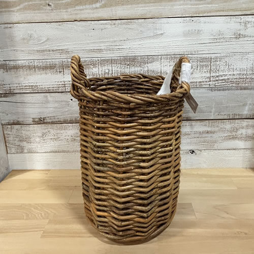 ヨーロッパのアンティークデザインを思わせる風合い豊かな皮つきラタンバスケット。 スリムな縦型で長いものを収納するときにも便利です。